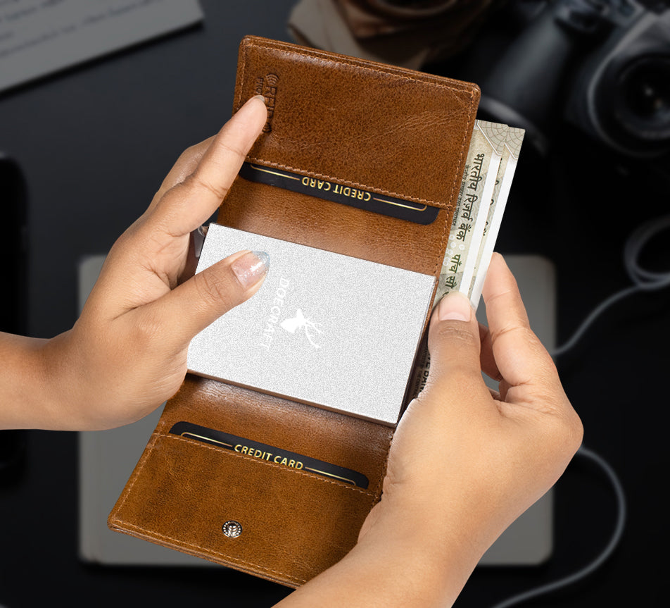 Elevate your everyday essentials with this sleek and sophisticated wallet, crafted from premium top-grain leather for a luxurious look and feel. Designed for both style and functionality, it features 8 card slots and a unique silver metal card case with an embossed Deer 3D print, combining elegance with durability.